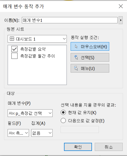 그 후 '매개변수.p_측정값 선택'을 클릭하고 뒤에 '추이'를 적어 주고 가운데 정렬 후 확인을 눌러줍니다.