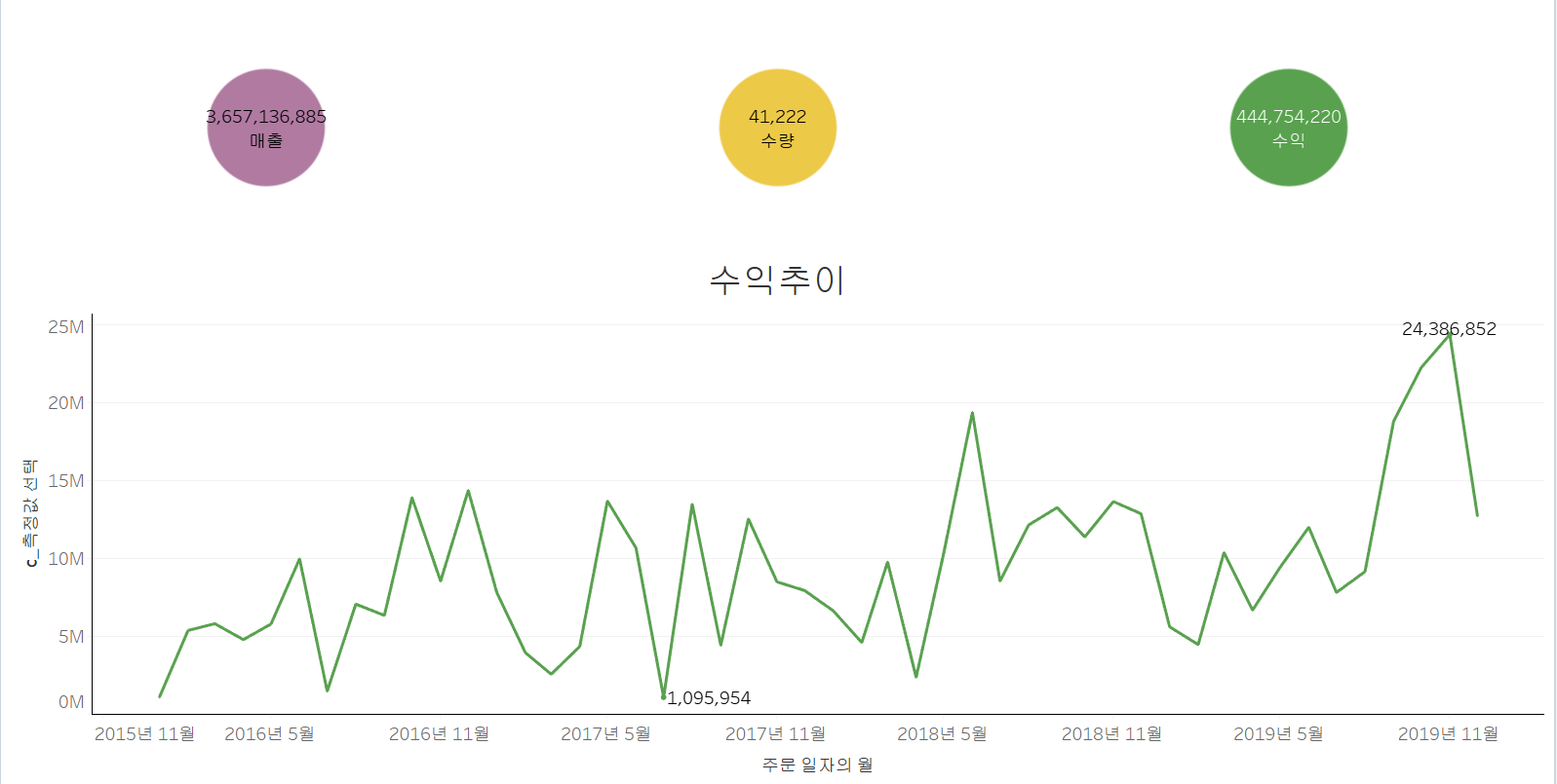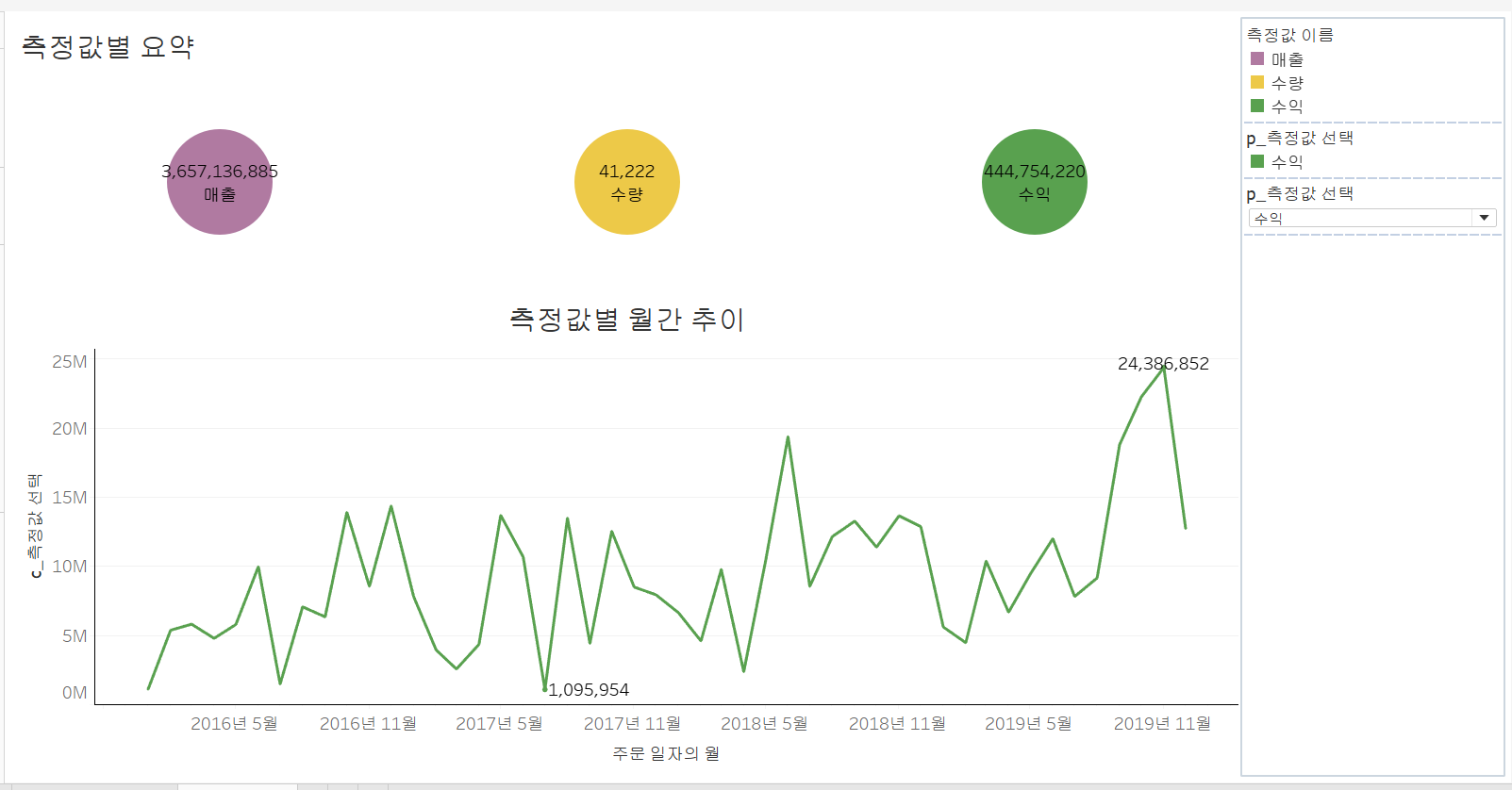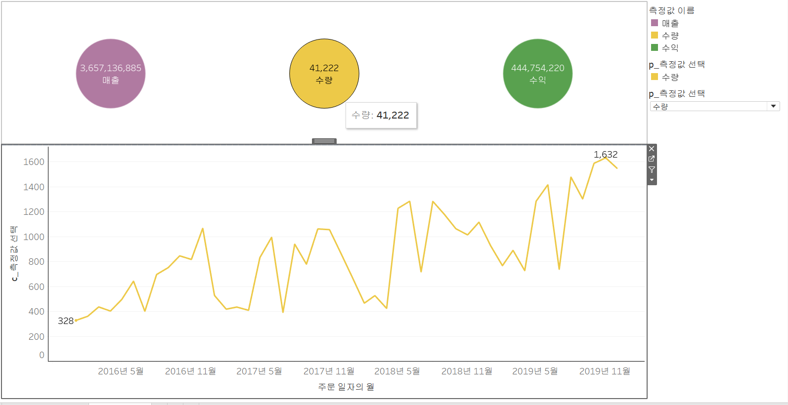 그러면 상단의 매출, 수량, 수익에 각 마우스 오버를 하면 해당하는 측정값의 추세가 하단의 라인으로 나타나게 되고 그에 해당하는 텍스트 제목이 변경되는 대시보드 완성입니다.