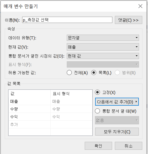 위와 같이 입력해줍니다. 생성된 매개변수를 우클릭 -> 매개 변수 표시를 선택합니다.