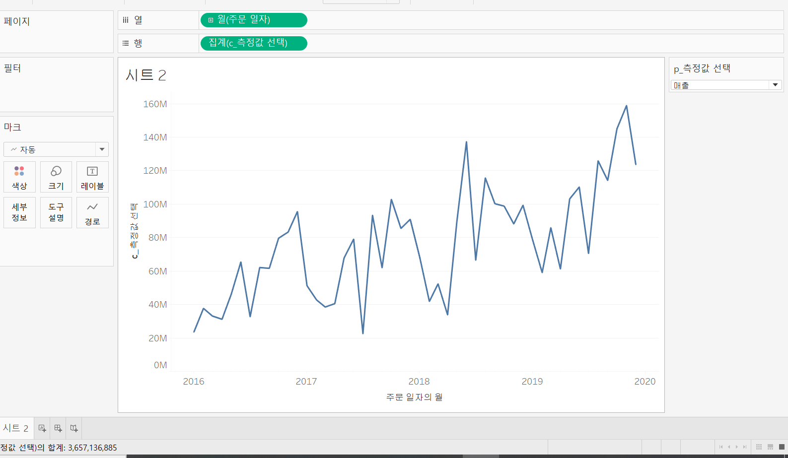 그 후 생성된 'c_측정값'을 더블 클릭하여 행선반에 올리고 이 측정값들을 월별 추세를 반영한 라인 그래프로 표현하기 위해 차원에 있는 '주문 일자'라는 필드를 마우스 왼오로 잡고 열선반에 올린 후 초록색 연속형 '월(주문일자)'를 선택한 후 확인버튼을 선택합니다.