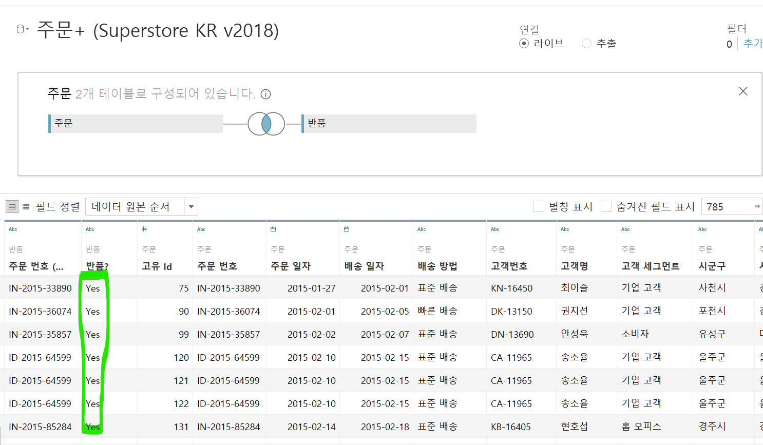 그 이유는 반품 시트에서 해당 필드에 반품된 것들만 'Yes'로 표시되고 있어서 안쪽 조인을 하면 반품된 것들만 표시가 됩니다. 이거를 왼쪽 조인으로 변경합니다.