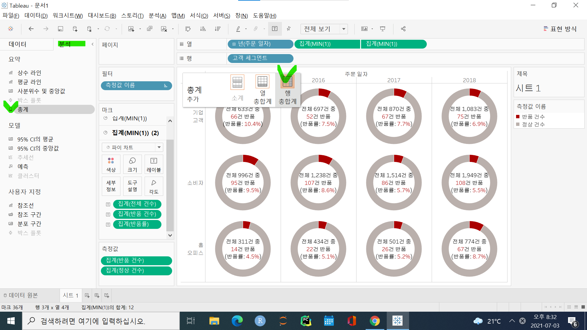 고객 세그먼트별 총계를 표현하기 위해 분석 패널에서 총계를 드래그해서 행 총합계 추가에 올립니다.