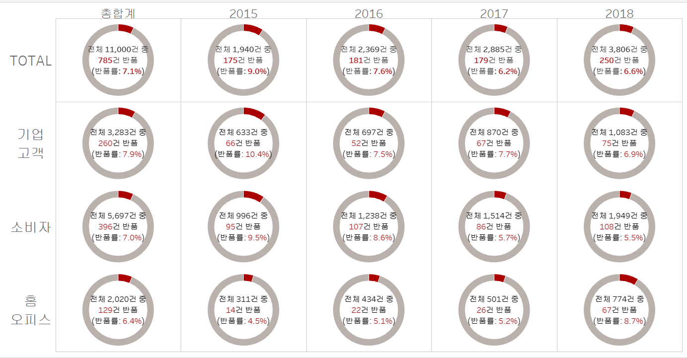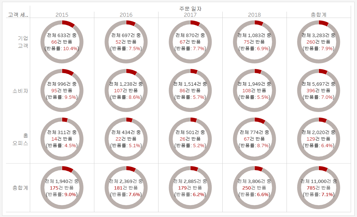 지금까지는 전체 반품률을 구했습니다. 이번에는 연도와 고객 세그먼트를 기준으로 나눠보겠습니다.