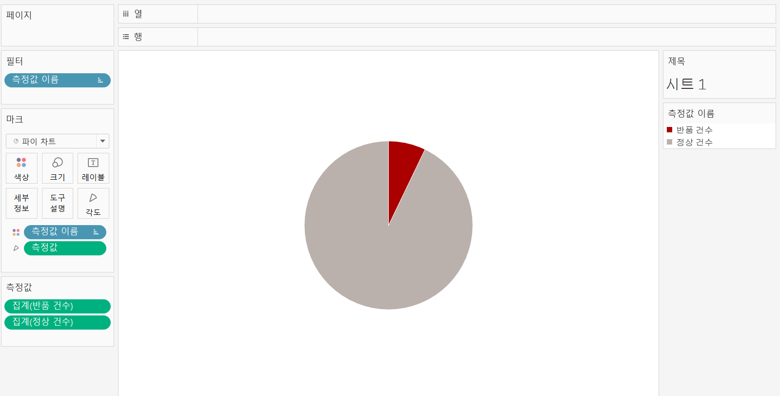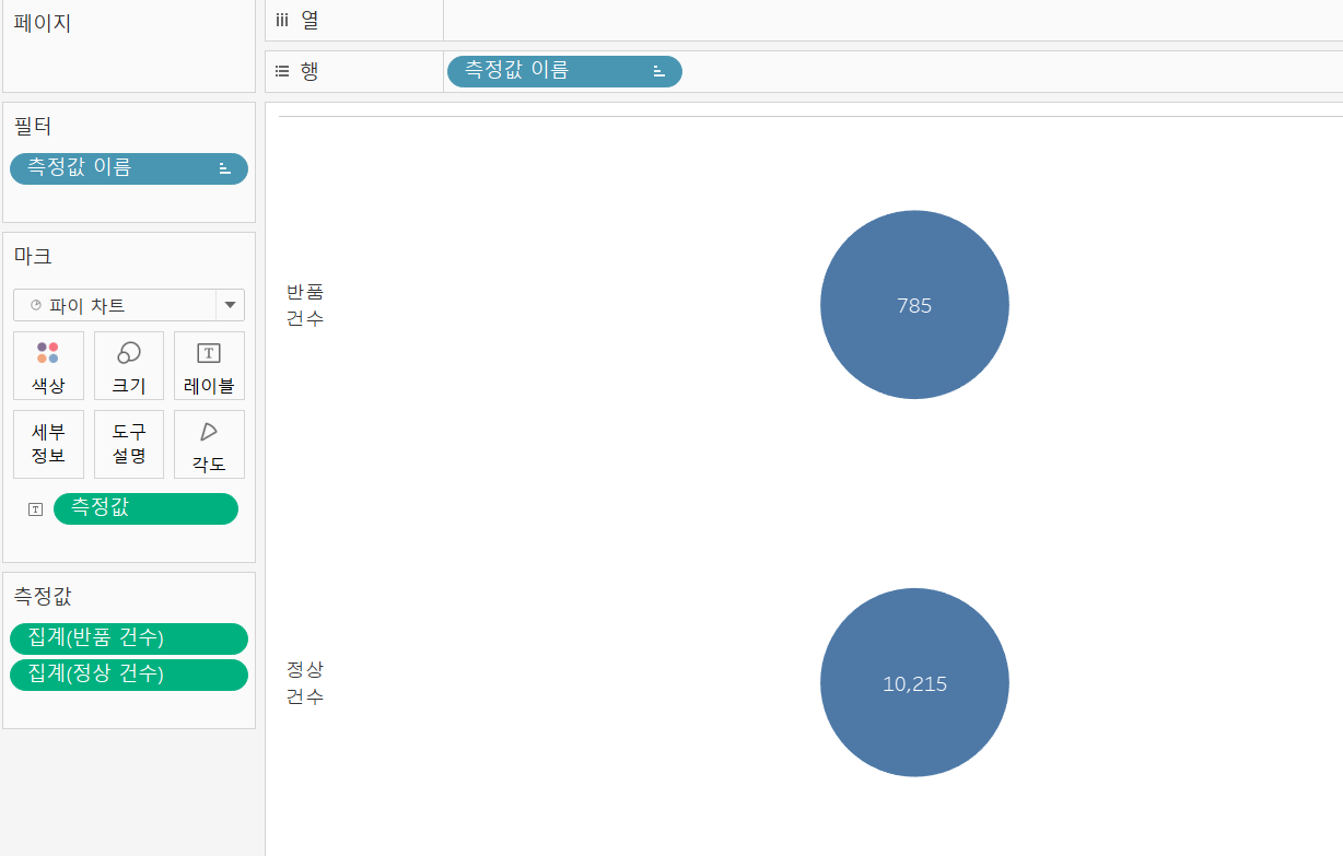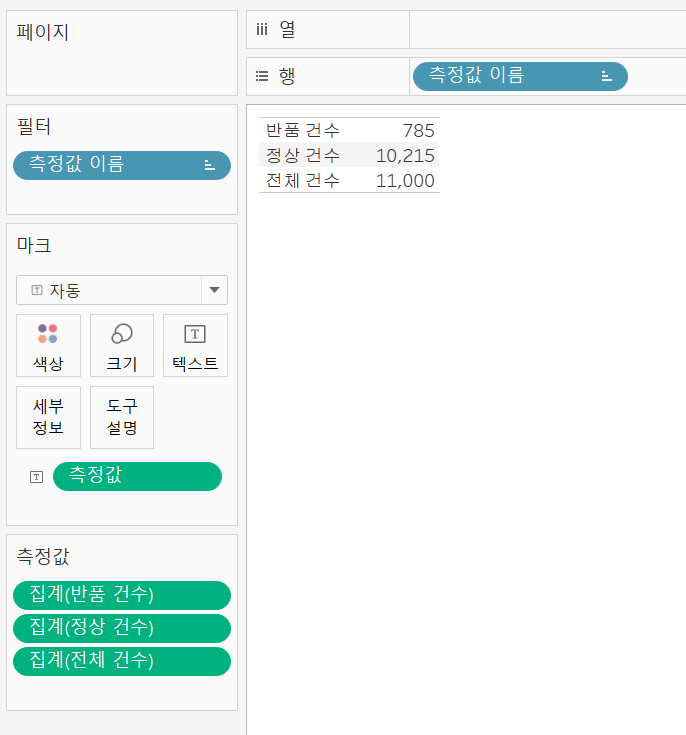 위와 같이 입력하고 생성된 정상 건수를 측정값 카드에 있는 반품 건수와 전체 건수 사이에 위치합니다.