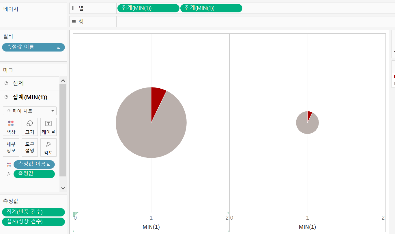 마크에 있는 집계(MIN(1))(2) 마크를 선택한 다음 색상과 각도로 지정되어 있는 측정값을 모두 밖으로 던져 줍니다. 그 후 '전체 건수'필드를 집계(MIN(1))(2) 마크의 레이블 위에 올립니다.