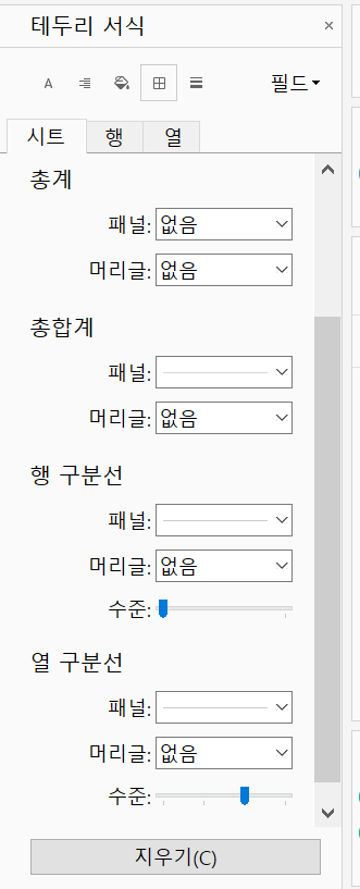 그 후 뷰를 우클릭 후 서식을 선택합니다. 그리고 총합계, 행 구분선, 열 구분선 모두 머리글을 없음으로 선택합니다.