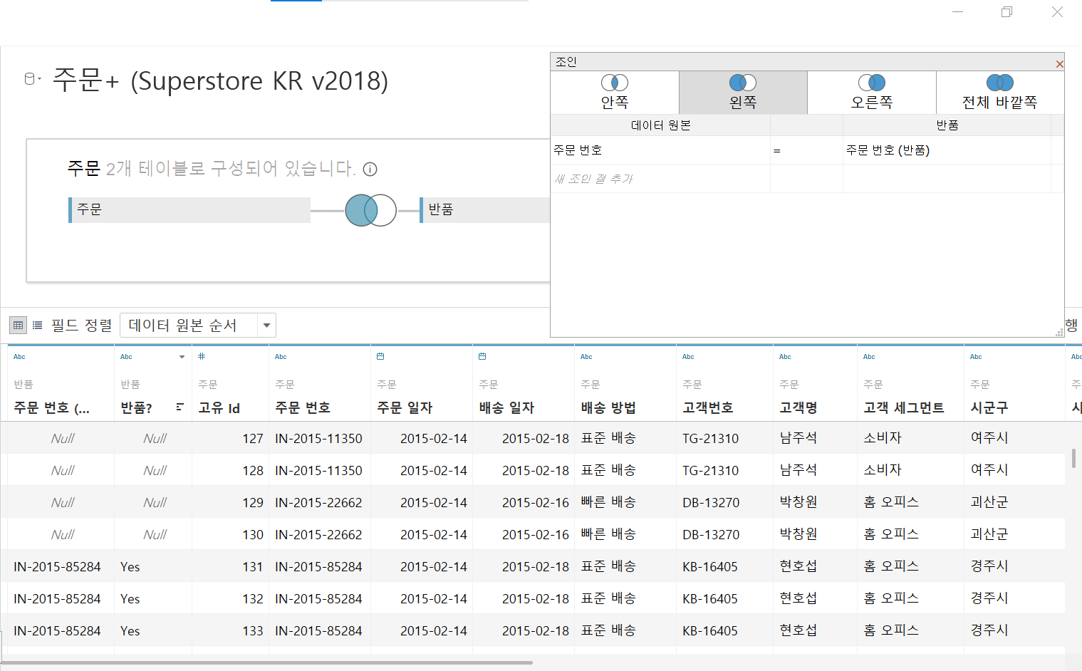 그 이유는 반품 시트에서 해당 필드에 반품된 것들만 'Yes'로 표시되고 있어서 안쪽 조인을 하면 반품된 것들만 표시가 됩니다. 이거를 왼쪽 조인으로 변경합니다.