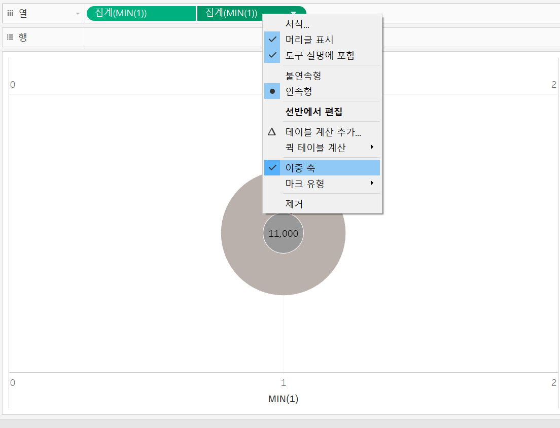 열 선반에 '집계(MIN(1))'을 우클릭 후 이중 축을 선택 시 도넛 차트를 만들 수 있습니다.