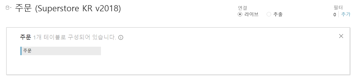 우선 '주문'시트를 드래그해서 캔버스 영역으로 올려줍니다. 그 후 생성된 테이블을 더블 클릭 한 후 아래와 같은 환경으로 만듭니다.