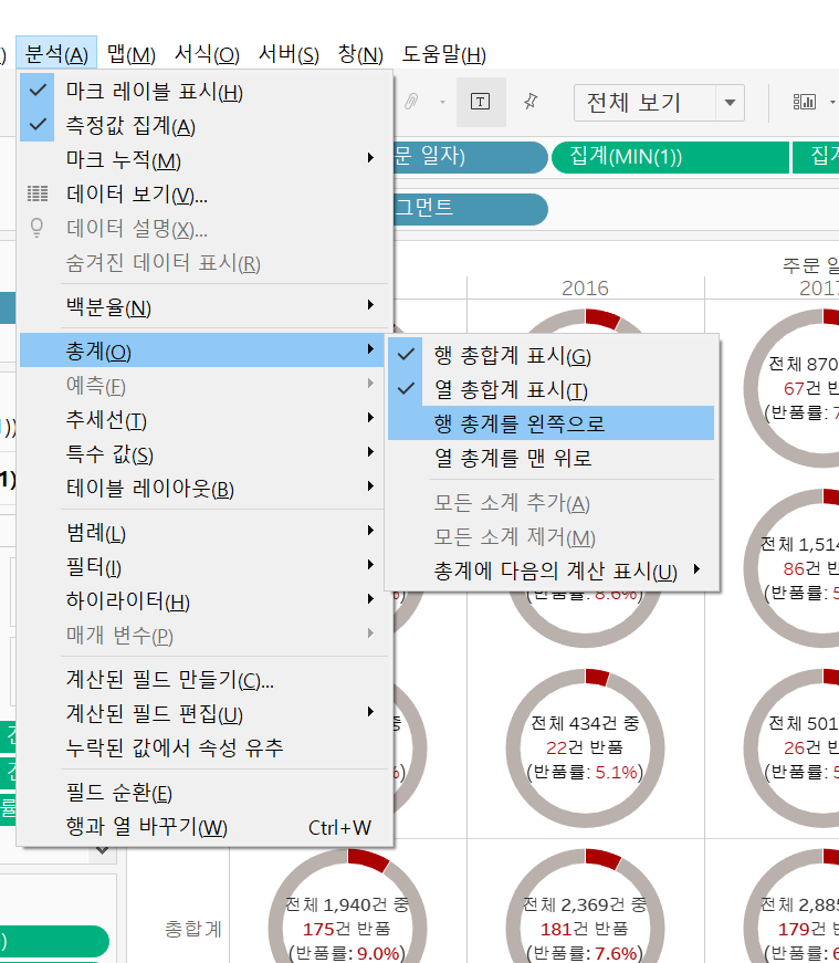 상단에 분석 메뉴에서 총계에 있는 '행 총계를 왼쪽으로'를 선택합니다.