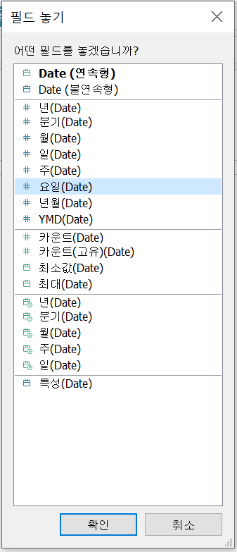 동일하게 진행하고 파란색 불연속형인 '요일(Date)'를 선택합니다.