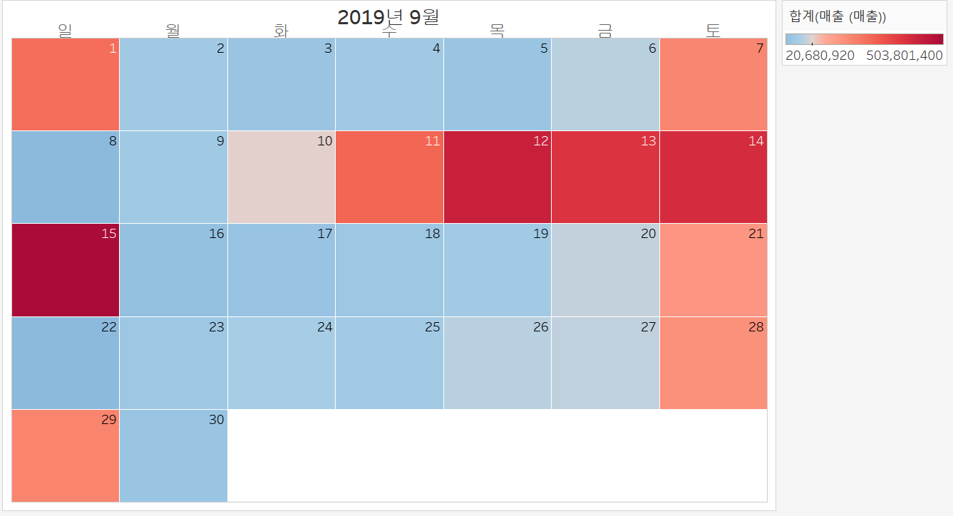 * 여기서 반전을 선택한 이유는 빨간색을 최댓값 색으로 지정하기 위함입니다. (보통 주말에 매출이 높게 나오기 때문에 달력에서 주말을 빨간색으로 표현하는 것과 동일하게 지정하여 더 쉽게 인사이트를 주기 위함)
